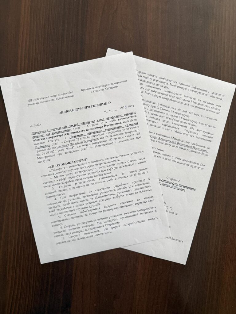 Співпраця з роботодавцями – запорука якісної, практикоорієнтованої освіти та підготовки конкурентоспроможних фахівців. Саме тому ДНЗ “Львівське вище професійне училище дизайну та будівництва” активно співпрацює з підприємствами Львова та області. В січні підписано меморандум про співпрацю з ПАТ “Концерн Хлібпром”, спрямований розвивати партнерство у сфері професійної освіти.